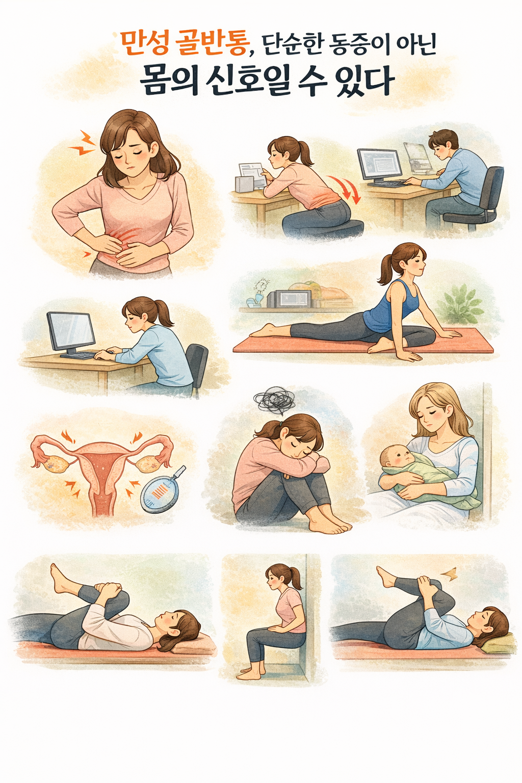 산후 회복기에 충분한 안정과 관리가 이루어지지 않으면 골반 정렬이 흐트러진 상태로 굳어지며, 이후 만성 골반통으로 이어질 가능성이 커진다.
